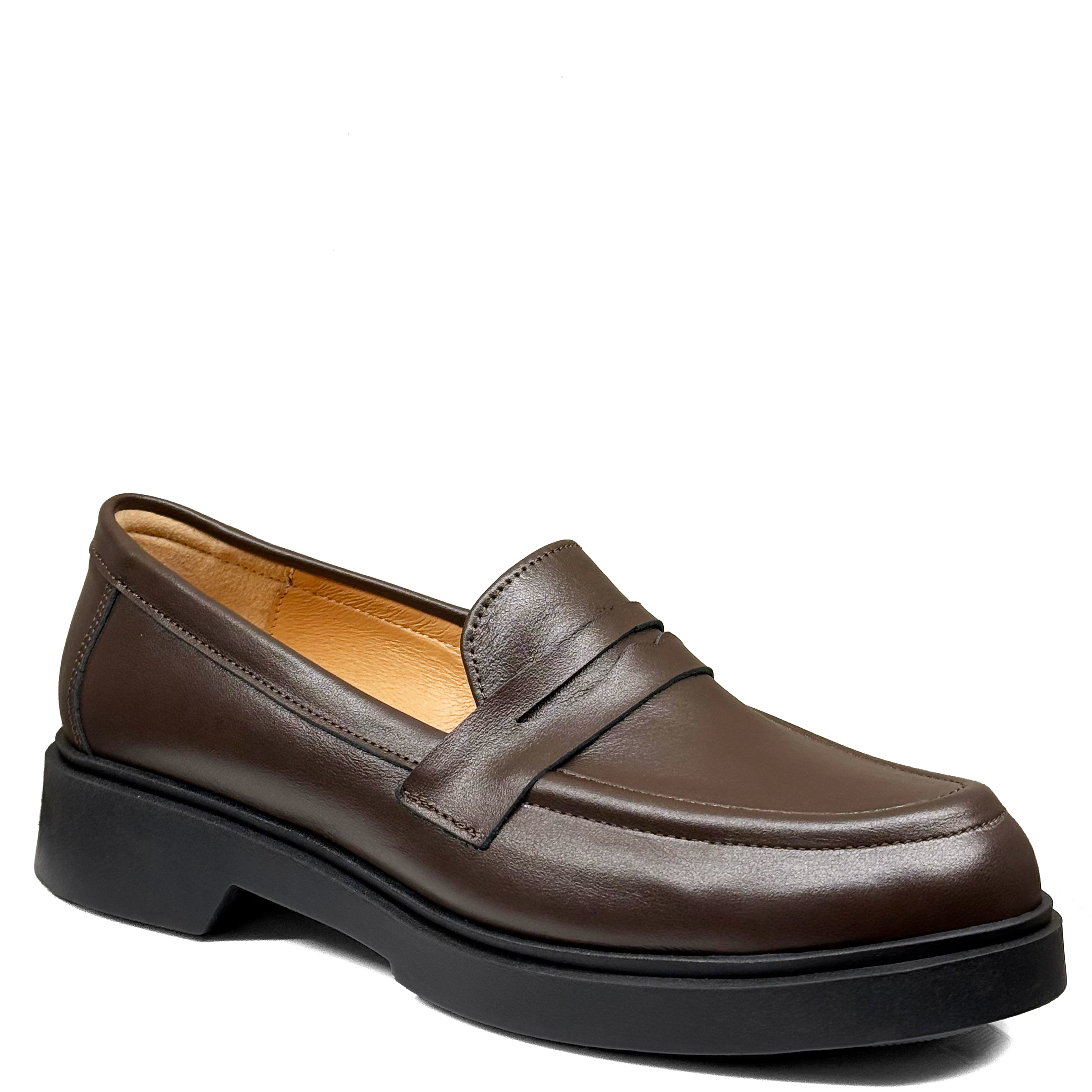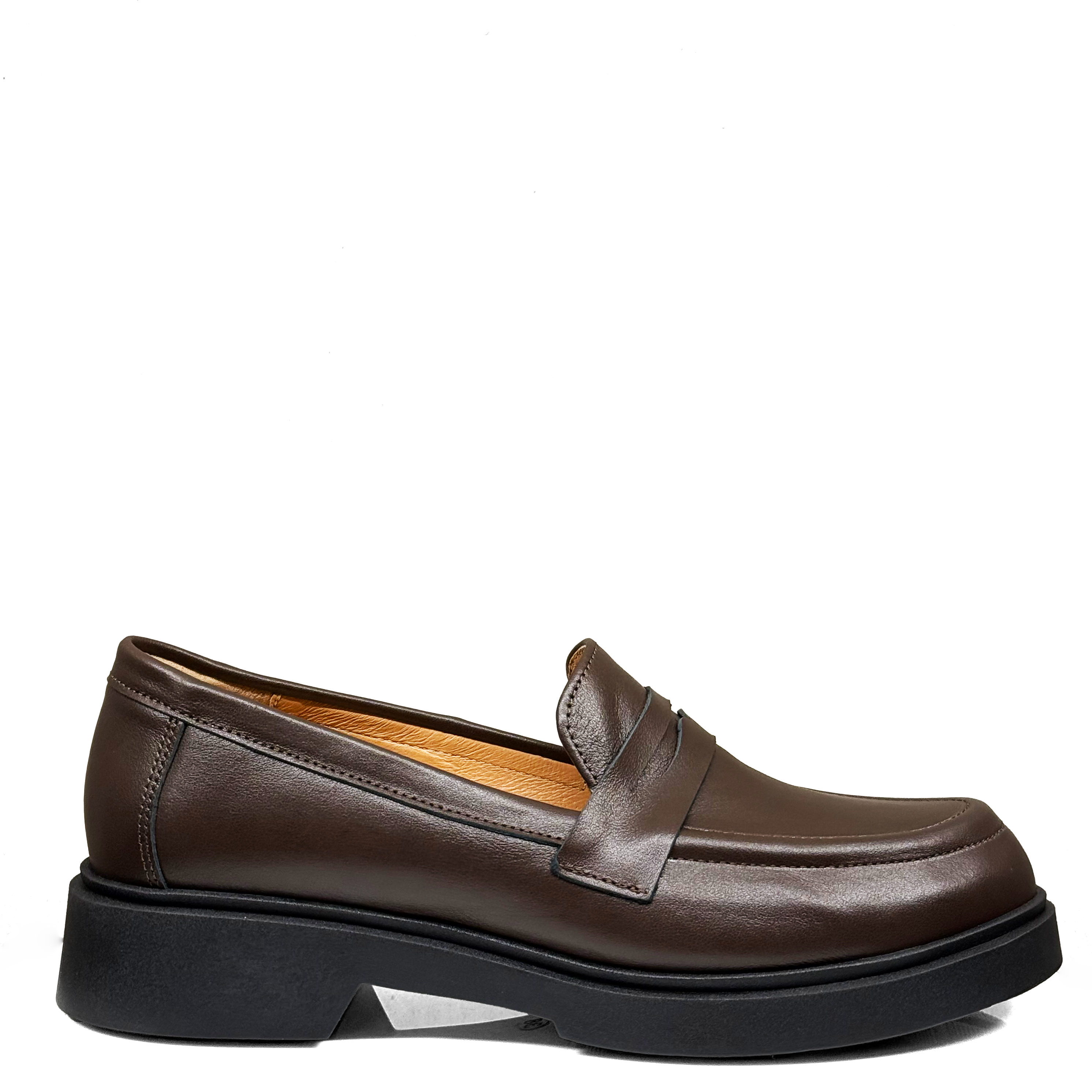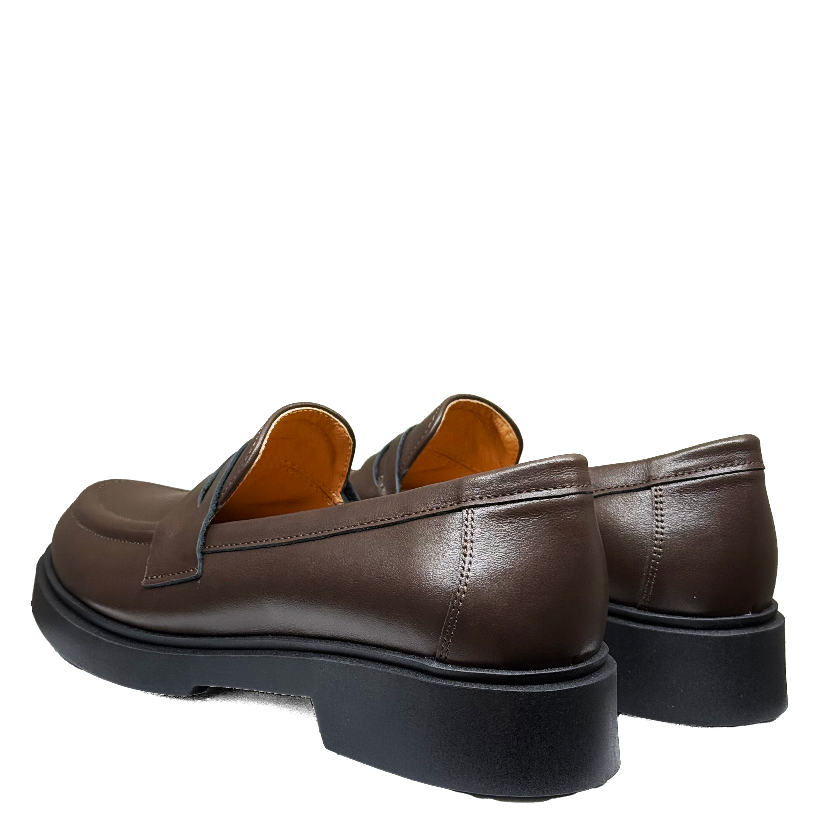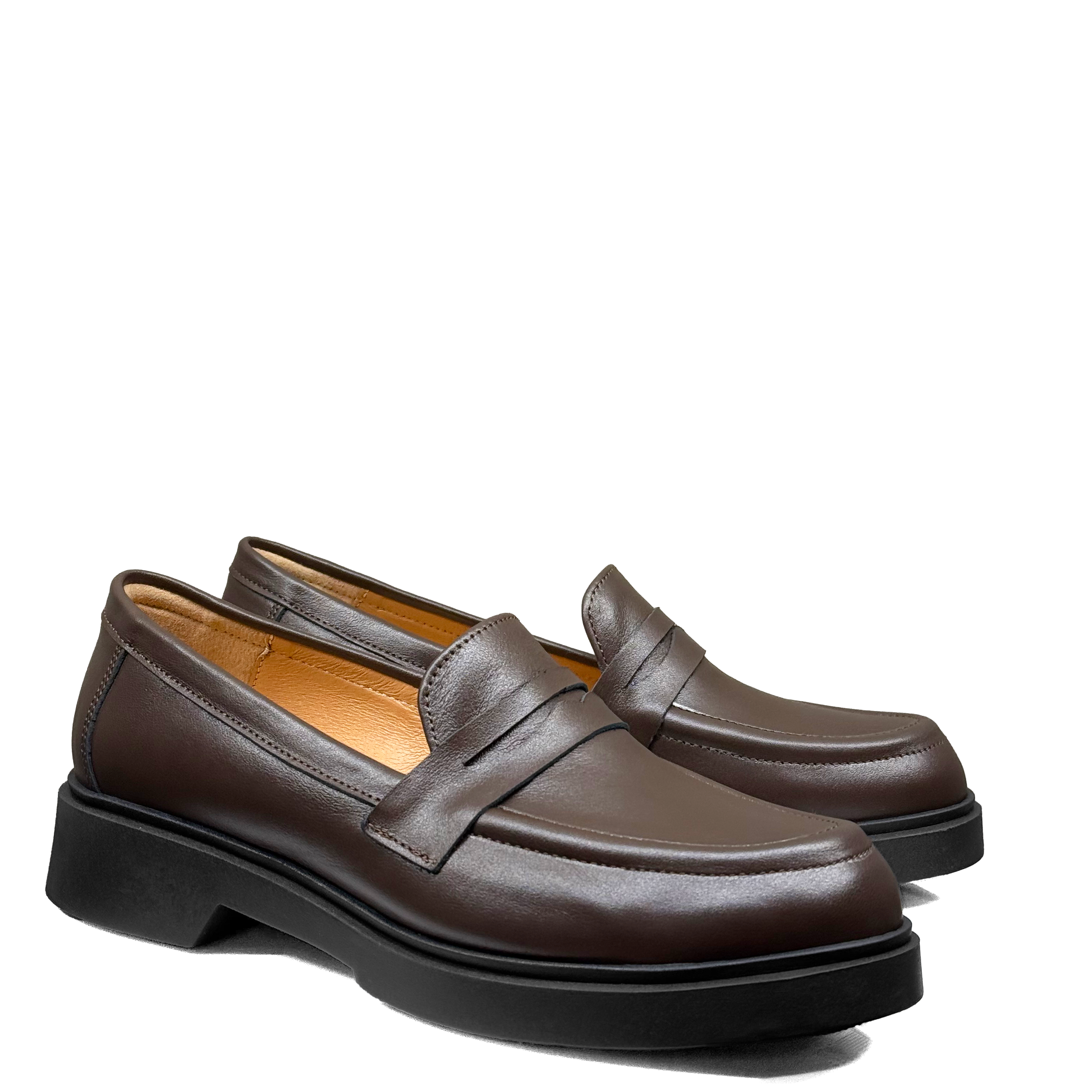 Nasze czekoladowe mokasyny to fason, który nie przemija. Klasyczny pasek na podbiciu (tzw. penny loafer) nawiązuje do elitarnego stylu preppy, podczas gdy masywna, czarna podeszwa osadza model w najnowszych trendach street style.