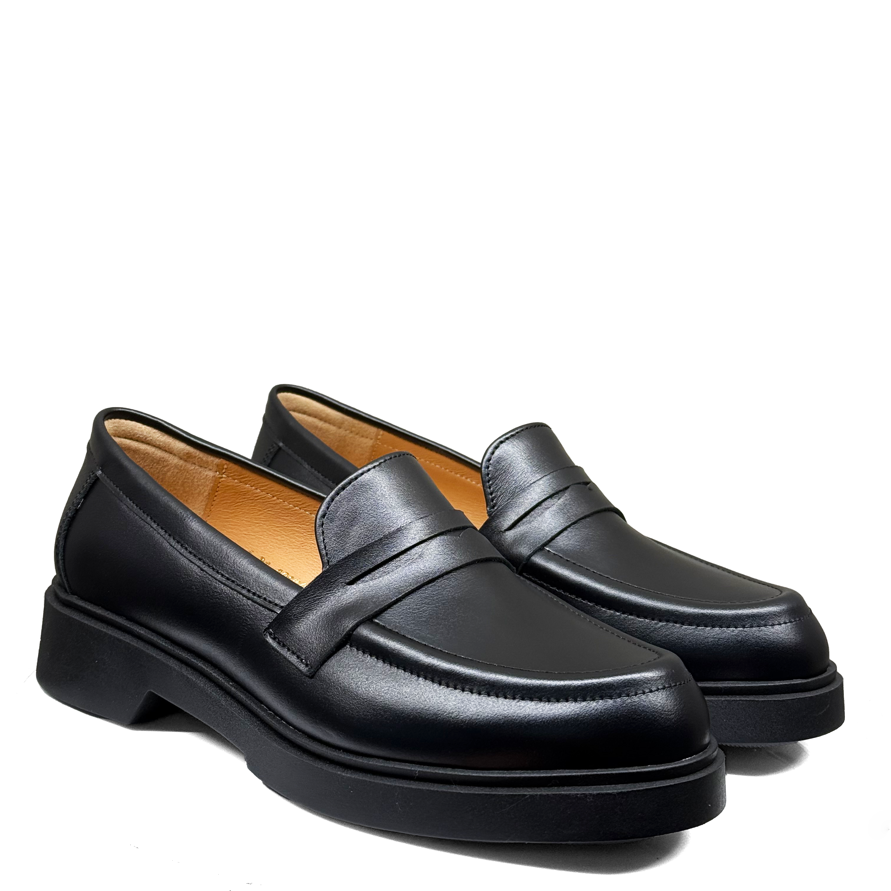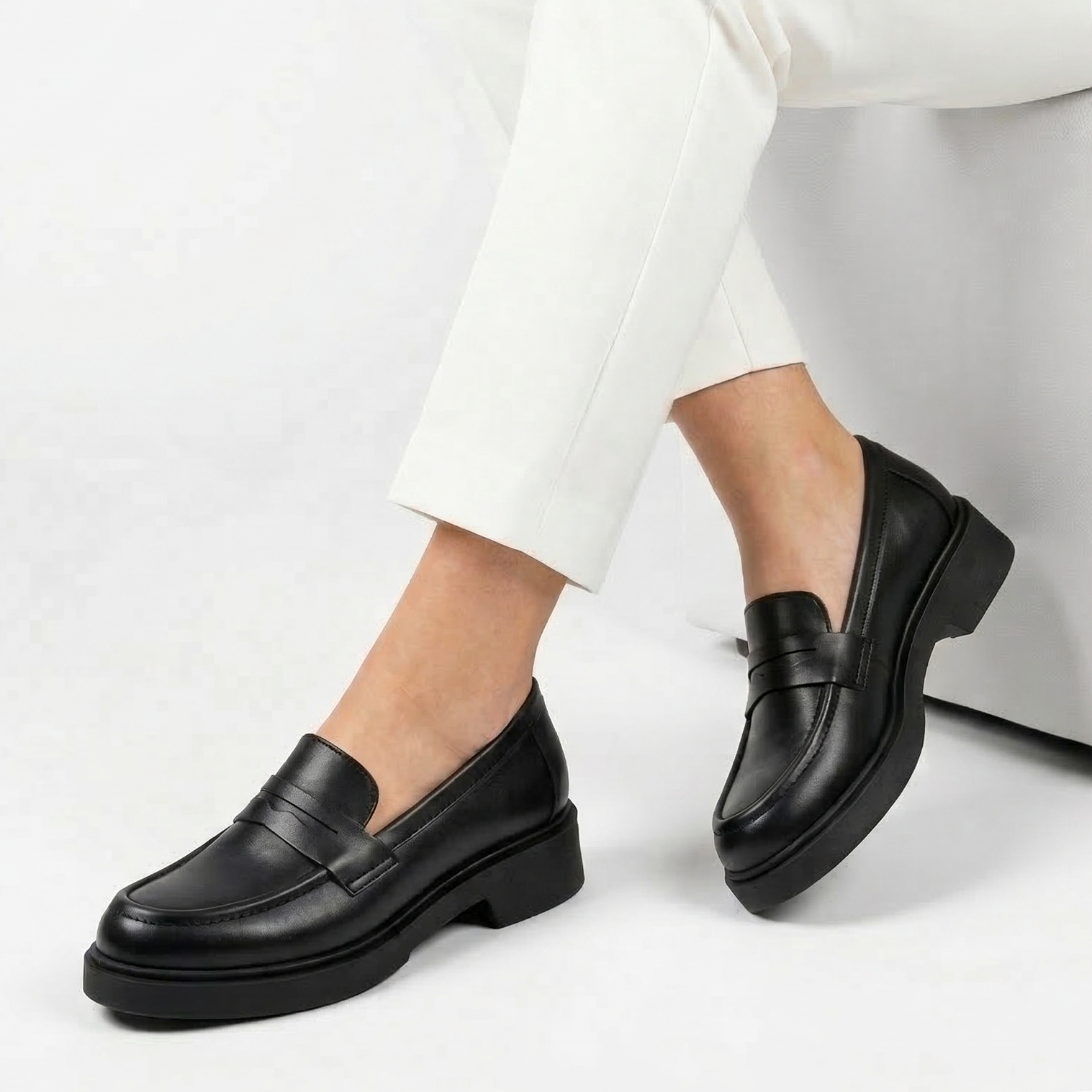 Model ten to współczesna interpretacja kultowych "penny loafers". Zachowano charakterystyczny pasek z nacięciem na podbiciu, który nadaje butom elegancki, nieco męski, ale niezwykle stylowy charakter. Wyraźne, ale subtelne przeszycia podkreślają kunszt krawiecki i solidność konstrukcji.